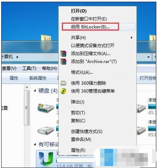 1、將u盤插入電腦usb接口,找到u盤盤符并右鍵點擊該u盤,點擊啟用BitLocker。如果右鍵找不到這項,可以點控制面板-BitLocker驅(qū)動器加密,選擇插入的u盤即可。