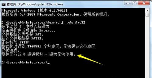 2.接著輸入“format j: /fs:fat32”(其中j代表U盤所在盤符)并按回車鍵執(zhí)行U盤格式化操作。