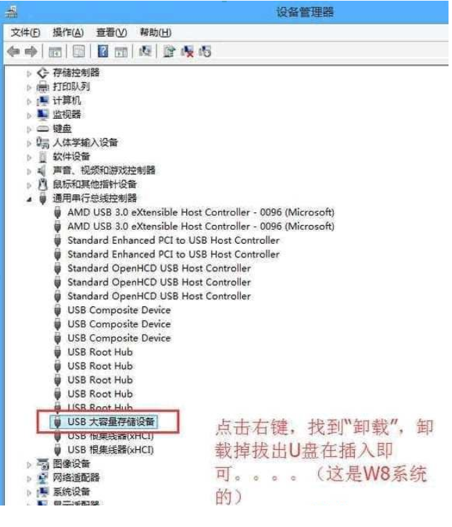 4、如果沒(méi)有黃色感嘆號(hào),那我們也可以嘗試鼠標(biāo)右鍵點(diǎn)擊USB大容量存儲(chǔ)設(shè)備,然后點(diǎn)擊卸載,再把U盤重新拔插一次即可顯示。