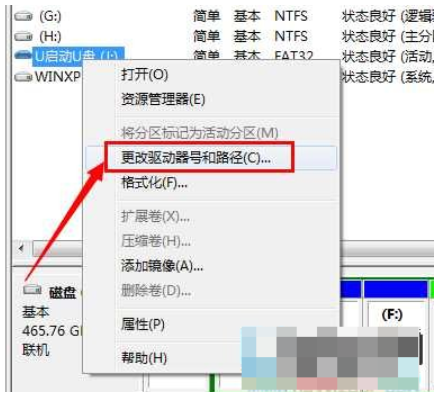 2、然后會(huì)發(fā)現(xiàn)右邊的磁盤1是可移動(dòng)的這就U盤。選中需要添加盤符的1.53G的活動(dòng)分區(qū),點(diǎn)擊鼠標(biāo)右鍵,選擇更改驅(qū)動(dòng)器號(hào)和路徑選項(xiàng)。