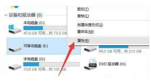 1、插入u盤,打開我的電腦,右擊U盤盤符,在彈出的右鍵菜單中選擇“屬性”。
