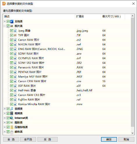 4. 在彈出的恢復(fù)文件窗口上選擇"開始",開始掃描。如果彈出如下窗口,可以指定深度掃描時的文件類型。