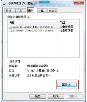 1. 打開(kāi)電腦,右擊“我的電腦”,右擊u盤(pán)盤(pán)符,選擇“屬性”。在彈出的窗口中切換到“硬件”選項(xiàng),選擇“屬性”。