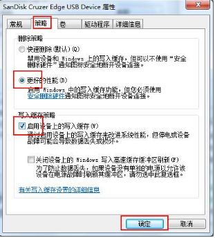 2. 在彈出的窗口中選擇“策略”,點(diǎn)擊“更好的性能”,并勾選“啟用設(shè)備上的寫(xiě)入緩存”選項(xiàng)。