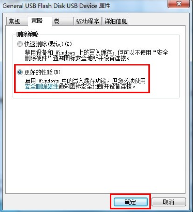 4、將策略改為“更好的性能”(xp系統(tǒng)則是“為提高性能而優(yōu)化”)。這樣就可以解決u盤被寫保護的問題啦。