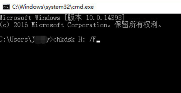 2、輸入“chkdsk H: /F”,其中“H:”是U盤盤符,輸入后點(diǎn)擊鍵盤回車鍵(用于檢查文件系統(tǒng)情況),提示沒問題的話直接重新拔插U盤。