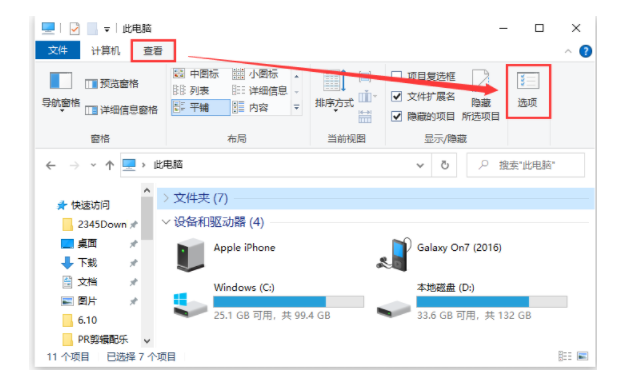 1、將U盤插入電腦后,打開「此電腦」,點(diǎn)擊「查看」→「選項(xiàng)」。