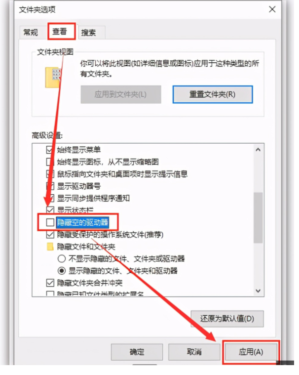2、,點(diǎn)擊「查看」,取消勾選「隱藏空的驅(qū)動(dòng)器」,最后點(diǎn)擊「應(yīng)用」。