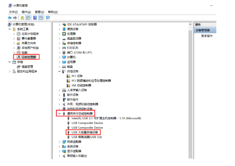 7、 進(jìn)入到「計(jì)算機(jī)管理」界面,點(diǎn)擊「設(shè)備管理器」,找到「通用串行總線控制器」,雙擊「USB大容量存儲(chǔ)設(shè)備」。