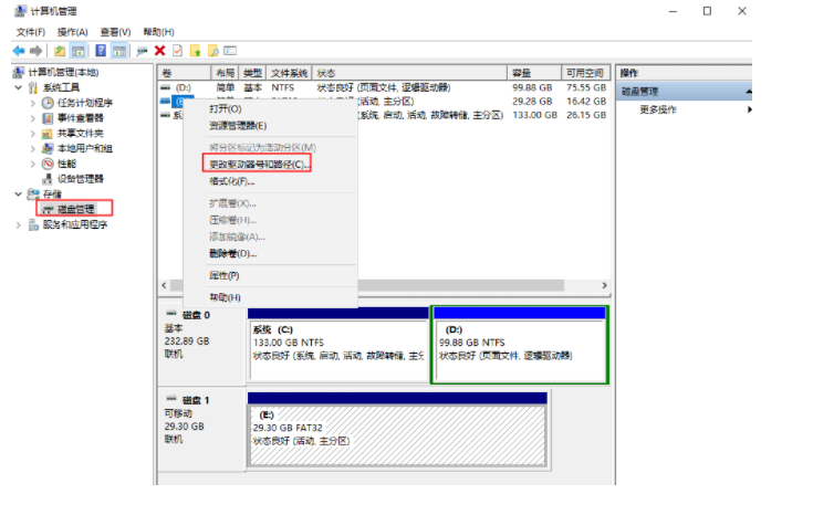5、進(jìn)入到「計(jì)算機(jī)管理」界面,在右側(cè)「存儲(chǔ)」→「磁盤管理」,找到「可移動(dòng)磁盤」,選擇「更改驅(qū)動(dòng)器號(hào)和路徑」。
