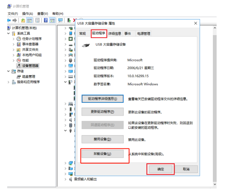 8、點(diǎn)擊「驅(qū)動(dòng)程序」→「卸載設(shè)備」→「確定」,卸載完后,重新插入U(xiǎn)盤,等待系統(tǒng)自動(dòng)加載U盤驅(qū)動(dòng)即可。