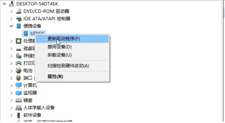 3、點擊便攜設(shè)備,然后鼠標(biāo)右鍵點擊驅(qū)動異常的U盤,單擊更新驅(qū)動程序。