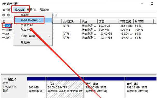 2、我們從C盤開始,逐一選中,單擊工具欄的【操作(A)】,選擇【重新掃描磁盤(R)】進(jìn)行修復(fù)就可以啦。
