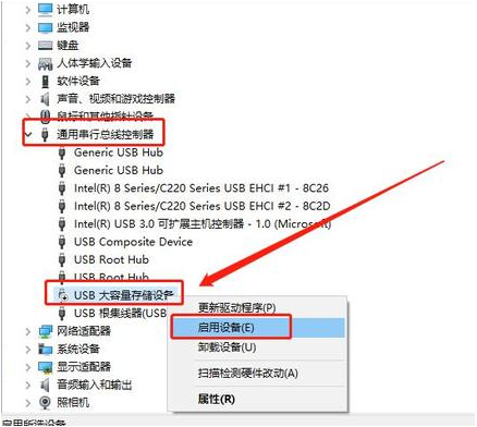2、進(jìn)入設(shè)備管理器界面后,右鍵【USB大容量存儲(chǔ)設(shè)備】,選擇【啟用設(shè)備】。