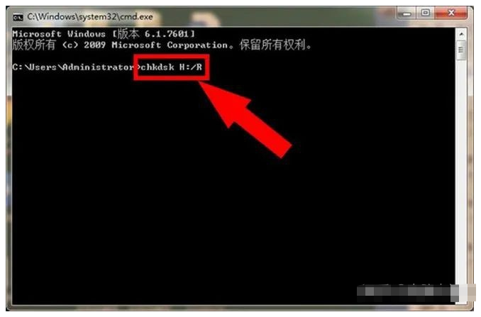 2、隨后在【administrator】后面添加一串命令字符【chkdsk H:/R】,其中的【H】代表的是U盤的盤符,確認(rèn)無誤后,按下【回車】鍵進(jìn)入下一步操作。