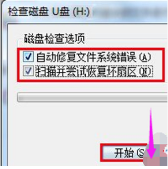 3.這時電腦將會彈出一個磁盤檢查選項窗口,我們先將兩個選項都勾選上,再單擊開始按鈕,u盤中的文件越多,檢查修復時間越久,我們耐心等待。