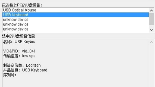 2、u盤檢測器可以對不同類型的的U盤檢測例如:USB Optical Mouse,USB Keyboard,unknow device,unknow device,unknow device。