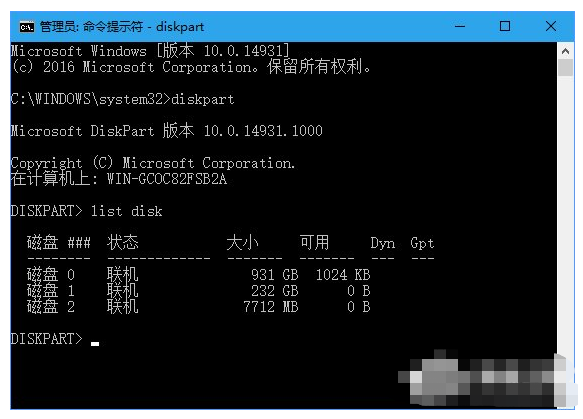 6、從容量上判斷可知磁盤2是我們指定的u盤,所以執(zhí)行select disk 2命令。