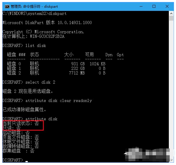 7、選好后執(zhí)行attributes disk clear readonly字符,即可清除寫保護(hù)屬性。若想驗(yàn)證是否清楚成功只需執(zhí)行命令attributes