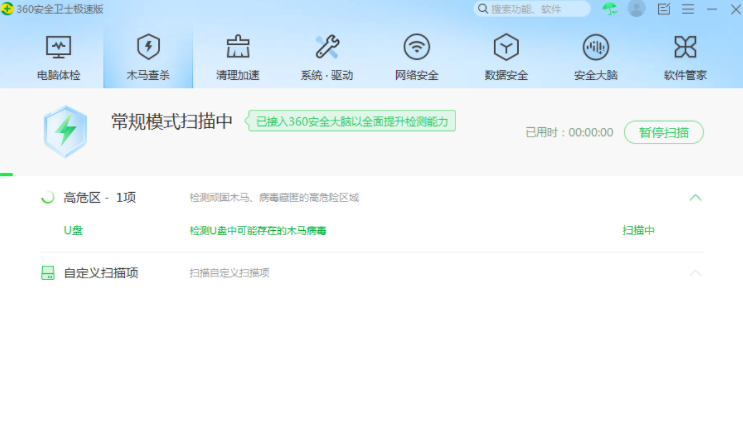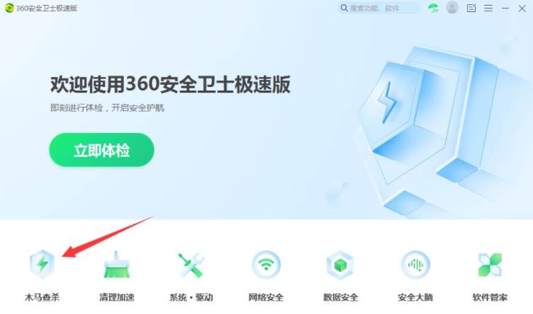 1、下載并運行360安全衛(wèi)士極速版,插入U盤,點擊木馬查殺。