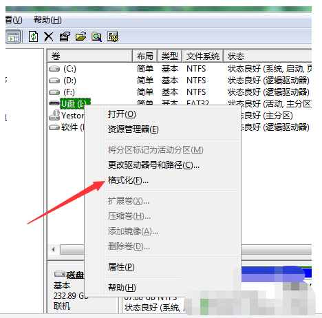 3、接下來右鍵點(diǎn)擊選中的U盤并且格式化
