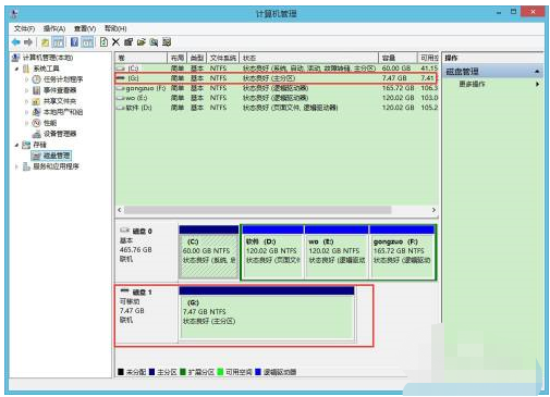 2、在剛打開的計(jì)算機(jī)管理窗口中,點(diǎn)擊“儲(chǔ)存--磁盤管理”,在右側(cè)可以看到我們需要操作的U盤