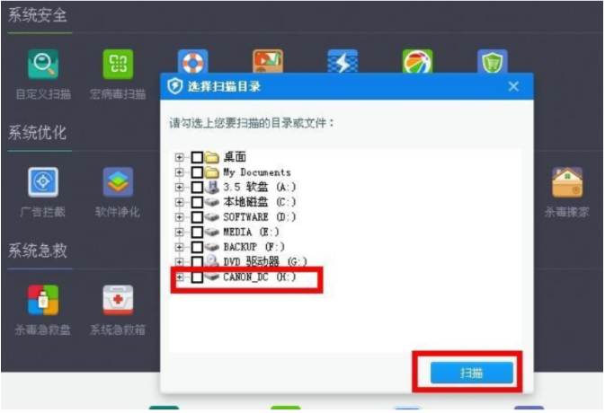 7、進入到自定義掃描頁面之后,將會彈出一個選擇框,選擇插入的U盤的盤符,點擊確定。