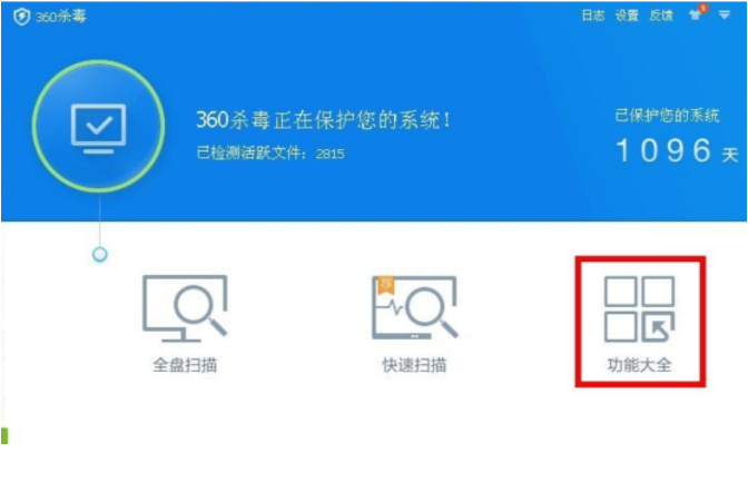 5、如果插入U盤后電腦沒有自動彈出U盤助手,那就直接點擊打開360殺毒,點擊功能大全。