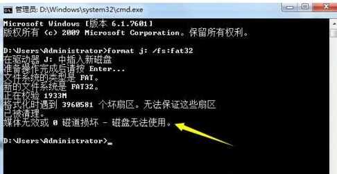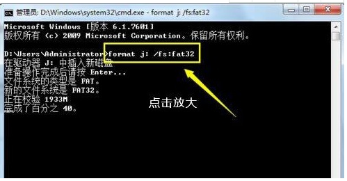 2、輸入“format j: /fs:fat32”,按回車鍵執(zhí)行U盤格式化;