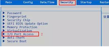 1、通常來說,重啟電腦不斷按下BIOS快捷鍵就可以進(jìn)入BIOS頁面。進(jìn)入BIOS頁面之后,通過使用方向鍵切換至“Security”選項(xiàng)卡,選擇“I/O Port Access”并按回車。