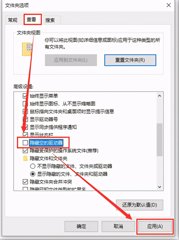 2、在文件夾選項界面中,切換至查看,將隱藏空的驅(qū)動器取消勾選,最后點擊應(yīng)用。