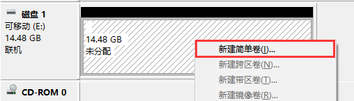 8、然后選中未分配的磁盤→新建簡(jiǎn)單卷。