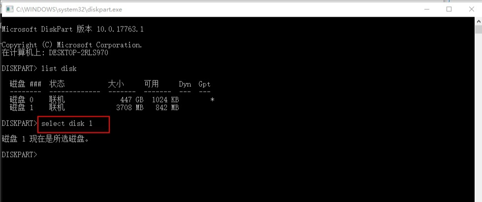 4.在輸入select disk 1,然后按回車,注意:disk和1之間必須要有一個(gè)空格格開(kāi),不明白的話大家可以直接復(fù)制這個(gè)命令運(yùn)行即可。