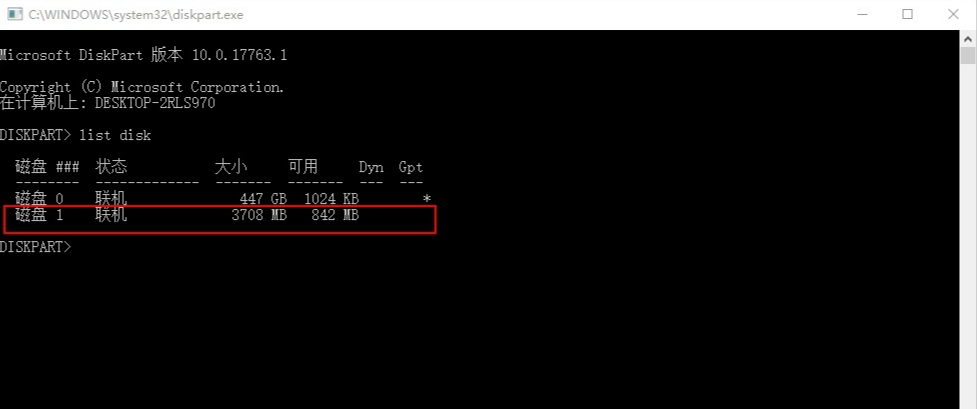 3.再輸入list disk,再按回車,此時(shí)即可看到這臺(tái)電腦的所有磁盤大致情況,u盤通常是磁盤1。