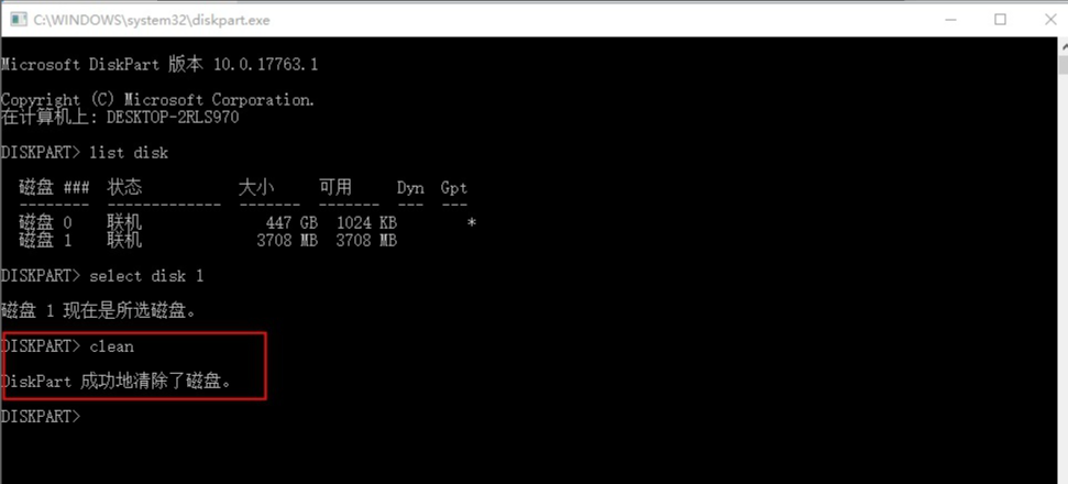5、然后輸入命令“clean”清除磁盤,也就是說(shuō)清除U盤本身。