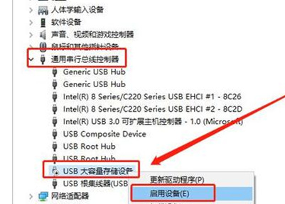 2.鼠標(biāo)右鍵【USB大容量存儲(chǔ)設(shè)備】,選擇【啟用設(shè)備】即可。