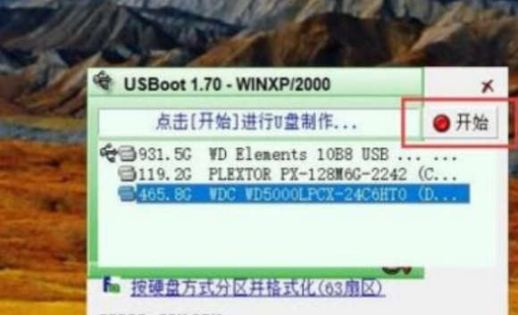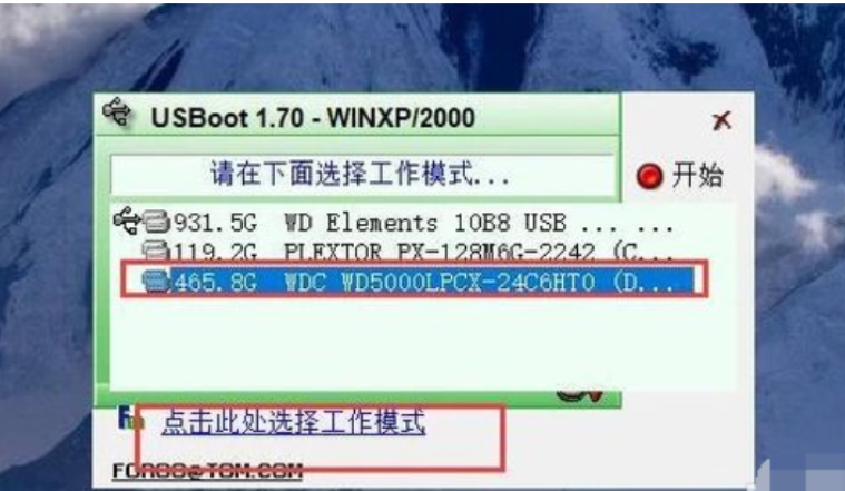 6、模式選擇好之后,點(diǎn)擊“開始”選項(xiàng),即可執(zhí)行U盤的引導(dǎo)操作,引導(dǎo)操作完畢之后,即可在Windows系統(tǒng)中格式化U盤設(shè)備,U盤格式化完畢之后寫保護(hù)就去掉了。