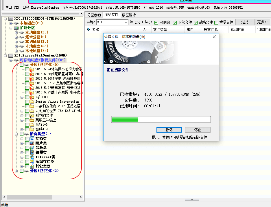 3、DiskGenius軟件就開始掃描用戶指定的U盤或U盤上的分區(qū),在掃描的同時,會將掃描到的文件及目錄顯示出來