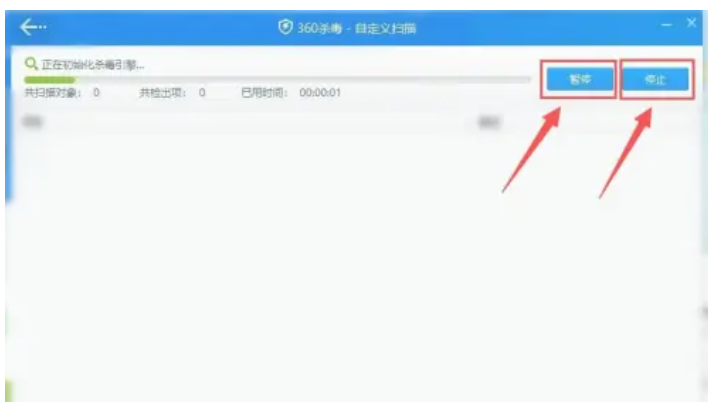 4.點擊掃描按鈕后360殺毒就會自動對所選U盤進行掃描,如下圖所示正在掃描U盤,掃描的過程中點擊暫?;蛲V拱粹o,可以暫?;蛲V箤盤的掃描。