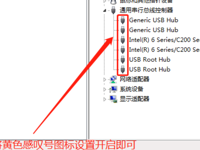 3、最后如果有發(fā)現(xiàn)帶黃色感嘆號的圖標(biāo),這標(biāo)志著USB被禁用,直接啟用即可。