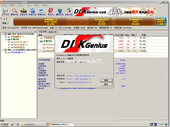 DiskGenius是一款優(yōu)秀的磁盤分區(qū)及數(shù)據(jù)恢復(fù)軟件,除具備基本的分區(qū)建立、刪除、格式化等磁盤管理功能。還提供了強(qiáng)大的已丟失分區(qū)搜索功能、誤刪除文件恢復(fù)、誤格式化及分區(qū)被破壞后的文件恢復(fù)功能、分區(qū)鏡像備份與還原功能、分區(qū)復(fù)制、硬盤復(fù)制功能、快速分區(qū)功能、整數(shù)分區(qū)功能、分區(qū)表錯誤檢查與修復(fù)功能、壞道檢測與修復(fù)功能。提供基于磁盤扇區(qū)的文件讀寫功能。支持VMware、 Virtual PC、 VirtualBox虛擬硬盤格式。支持IDE、SCSI、SATA等各種類型的硬盤。支持U盤、USB硬盤、存儲卡(閃存卡)。支持FAT12/FAT16/FAT32/NTFS/EXT3文件系統(tǒng)。