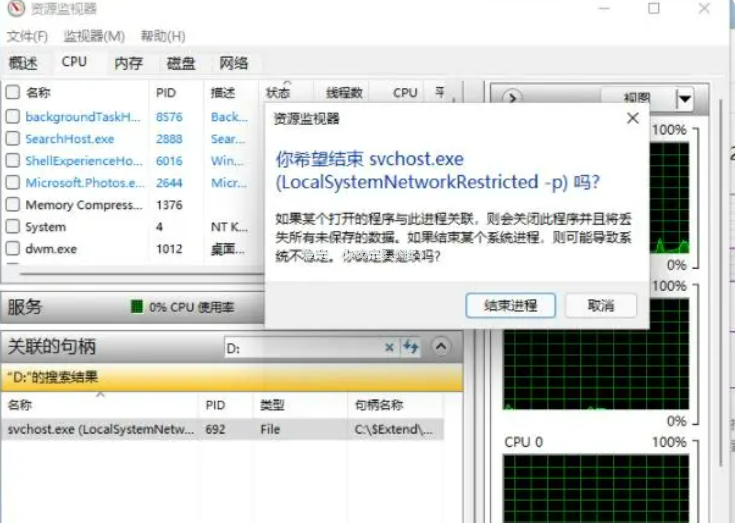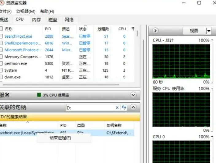 3、在資源監(jiān)視器里面,選擇cpu,我們可以看到關(guān)聯(lián)的 句柄旁邊的搜索框。