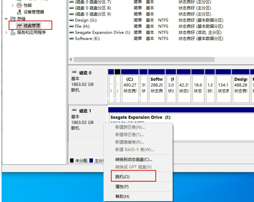 打開計(jì)算機(jī)管理->磁盤管理,右鍵,選擇脫機(jī),意思就是這個(gè)磁盤大家都別用了,系統(tǒng)也不能用 。然后再彈出磁盤。