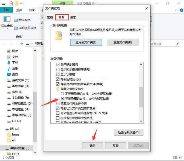 3、或者點擊旁邊的選項,點擊打開文件夾選項,點擊查看,勾選“顯示隱藏的文件、文件夾和驅動器”,點擊確定就可以啦。