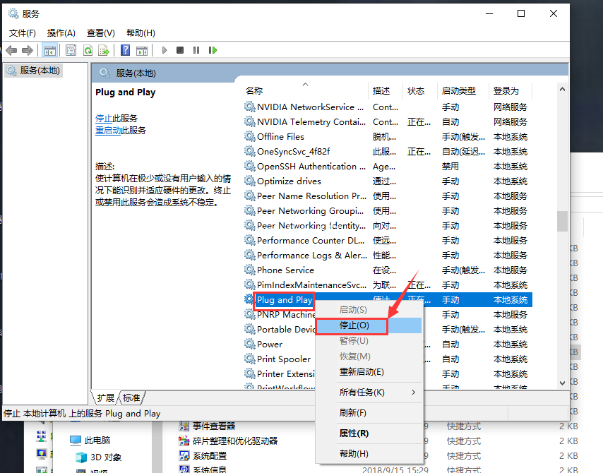 5、在打開的服務(wù)窗口界面中,下拉進(jìn)度欄以找到“plug and play”服務(wù)選項,鼠標(biāo)右鍵點(diǎn)擊將其設(shè)置“停止”,鼠標(biāo)右鍵點(diǎn)擊將其更改為“啟動”就可以解決電腦無法識別U盤的問題了。