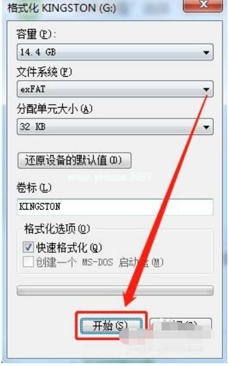 3、點(diǎn)擊“開(kāi)始”進(jìn)行格式化即可修改u盤(pán)文件系統(tǒng)格式。