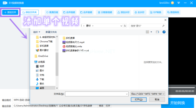 處理單個(gè)視頻時(shí),直接點(diǎn)擊左上角“添加文件”即可。