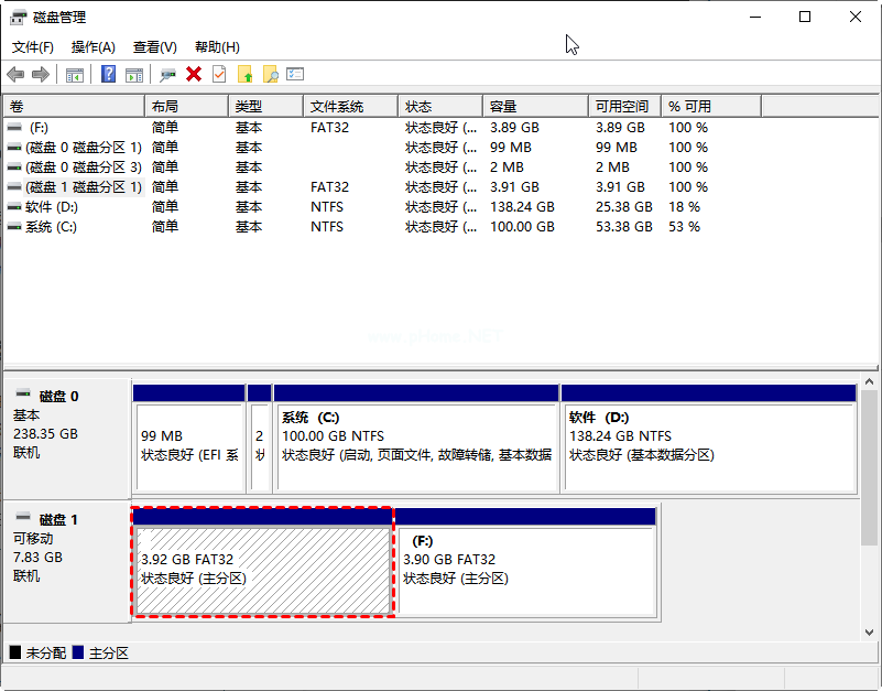 5. 返回磁盤管理主的頁(yè)面,就可以看到該U盤分區(qū)已經(jīng)沒(méi)有盤符了,成功隱藏U盤分區(qū)。