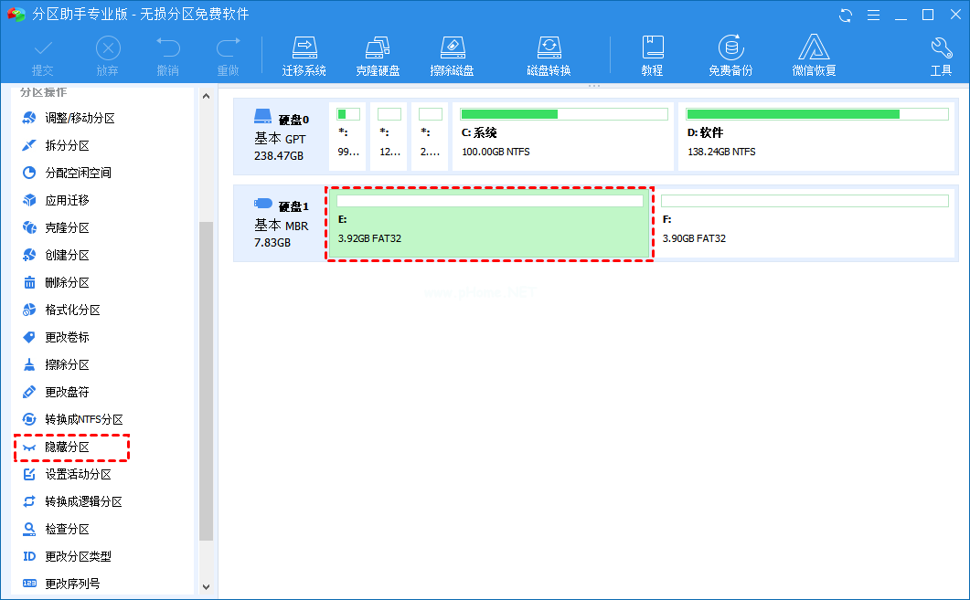 1.首先啟動(dòng)傲梅分區(qū)助手,選中我們需要隱藏的U盤分區(qū),再點(diǎn)擊左邊的“隱藏分區(qū)”。