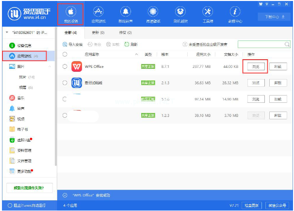 3、若是需要在手機上打開并查看Word或者Excel文檔,需要先下載可以打開文檔的應用軟件(例如WpsOffice),使用愛思助手導入文檔到應用文件夾即可。